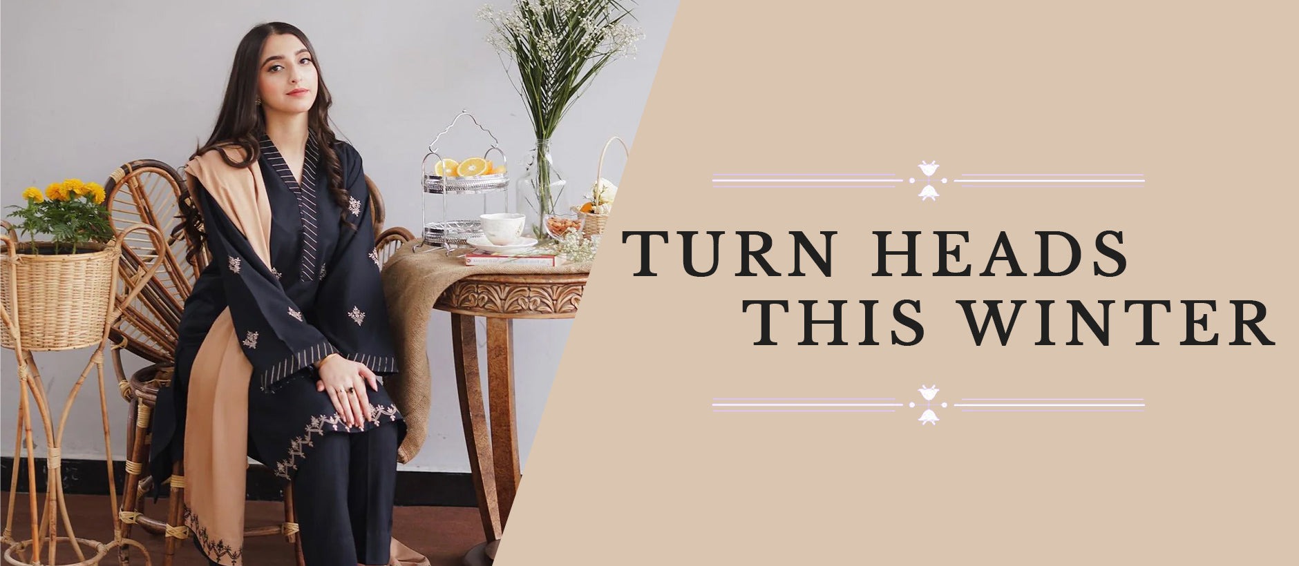 A graceful 3-piece beige winter outfit adorned with elegant black prints on the neckline, sleeves, and hem. Crafted from soft and warm Marina fabric, it offers both comfort and sophistication for the chilly season. The straight-cut design makes it perfect for casual days and elegant evenings alike.