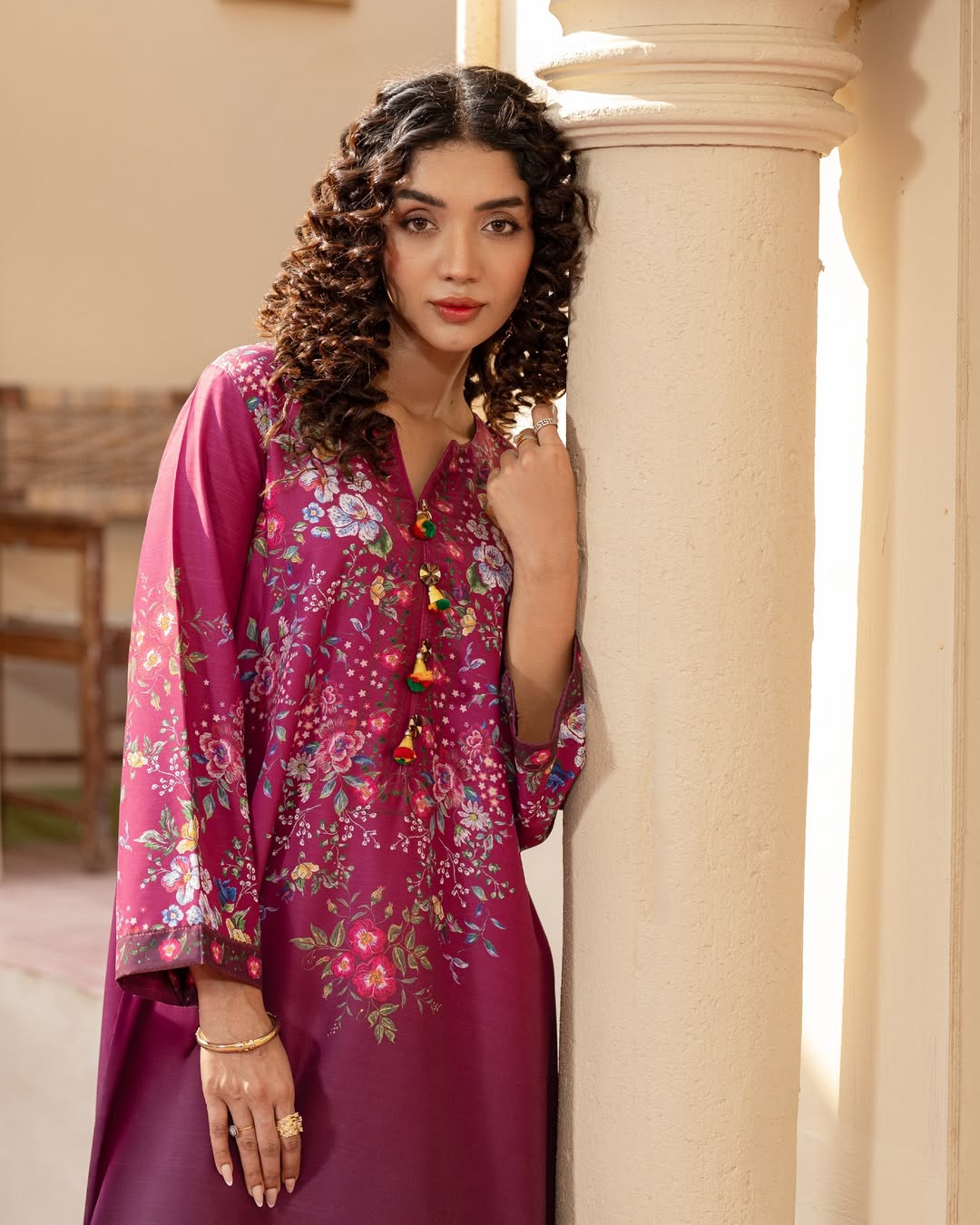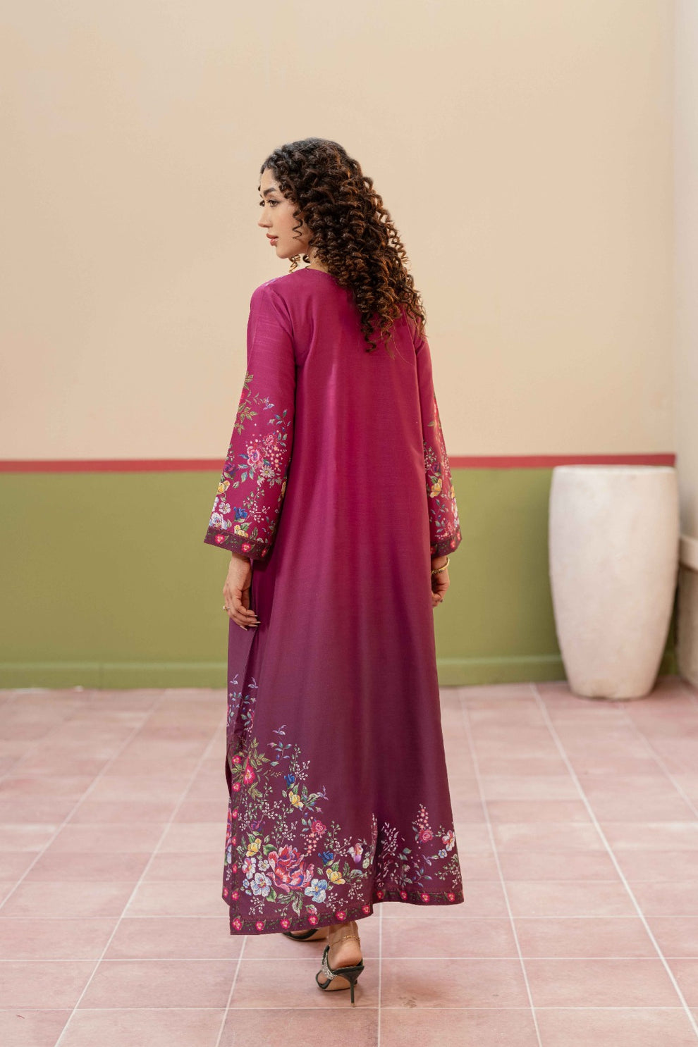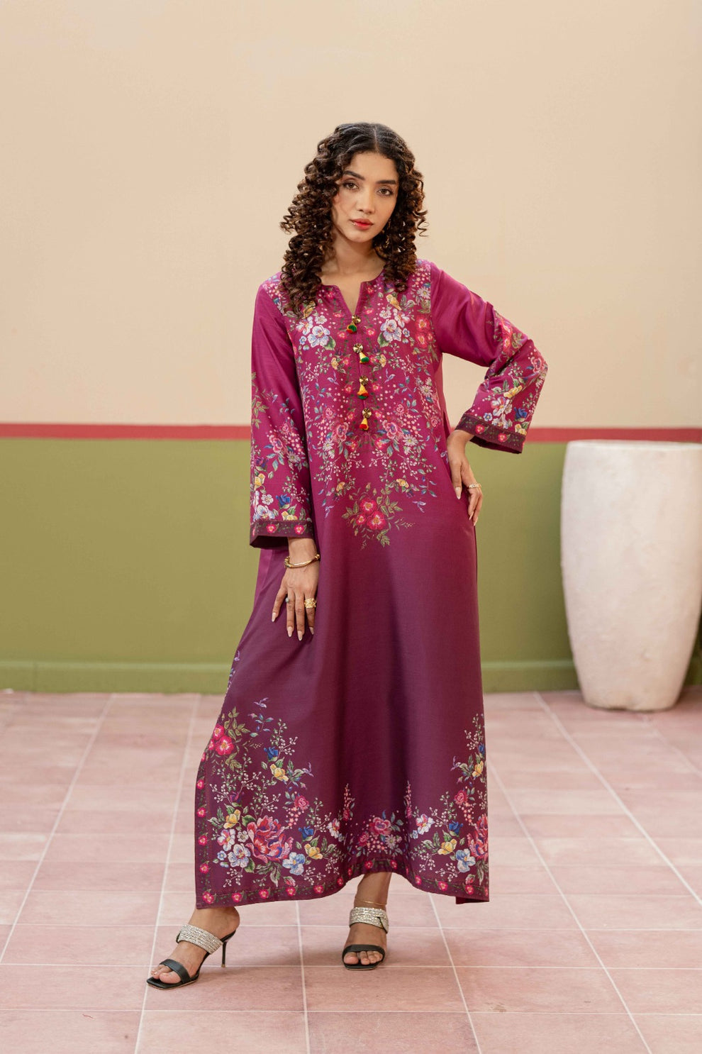 The long shirt features exquisite floral prints delicately spread across the bodice, sleeves, and hem, creating a harmonious blend of tradition and modern charm. Subtle detailing on the neckline adds a touch of finesse, making it perfect for both formal gatherings and festive occasions. Paired with a matching silk trouser, AYLA delivers a complete, polished look that is both comfortable and statement-worthy.