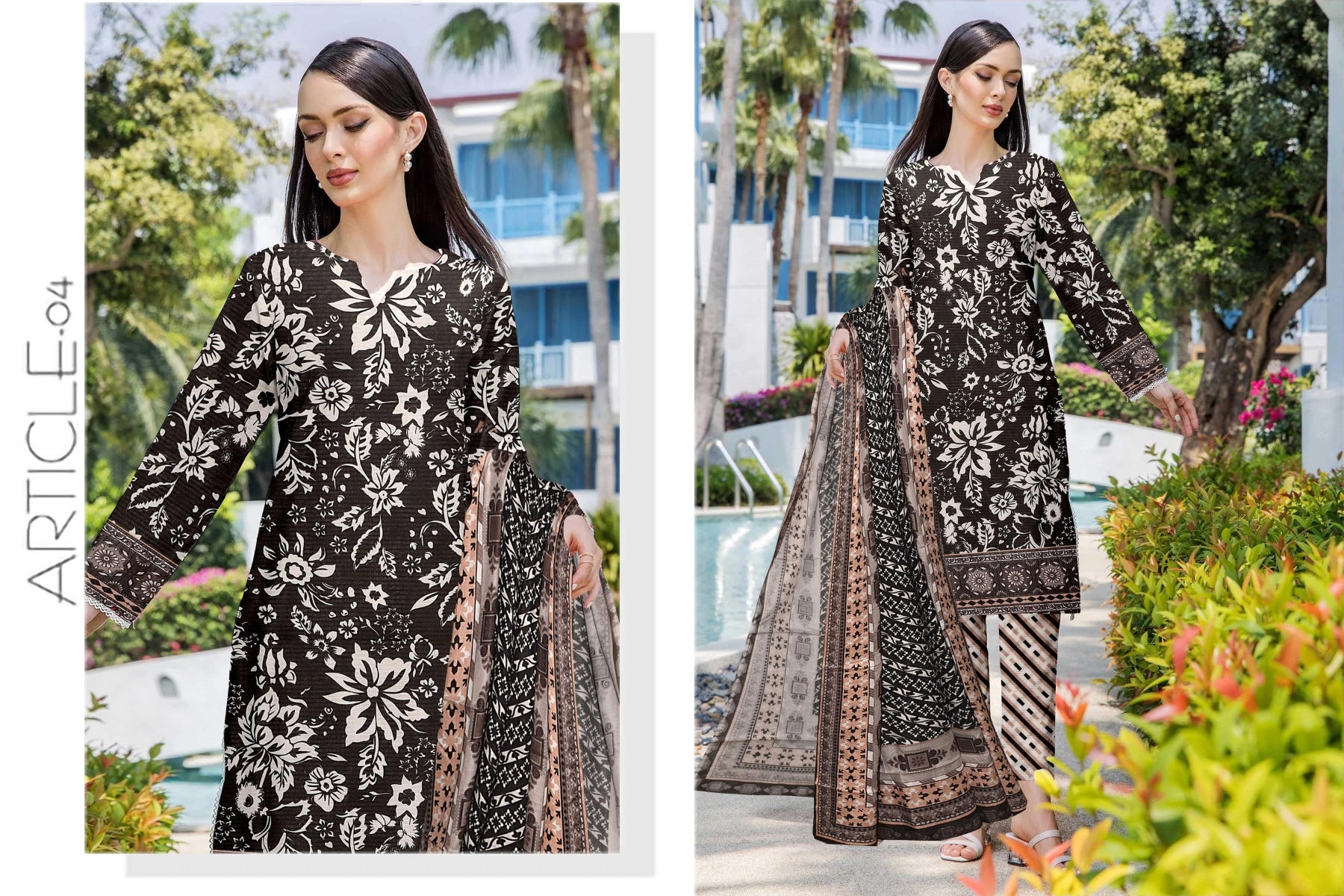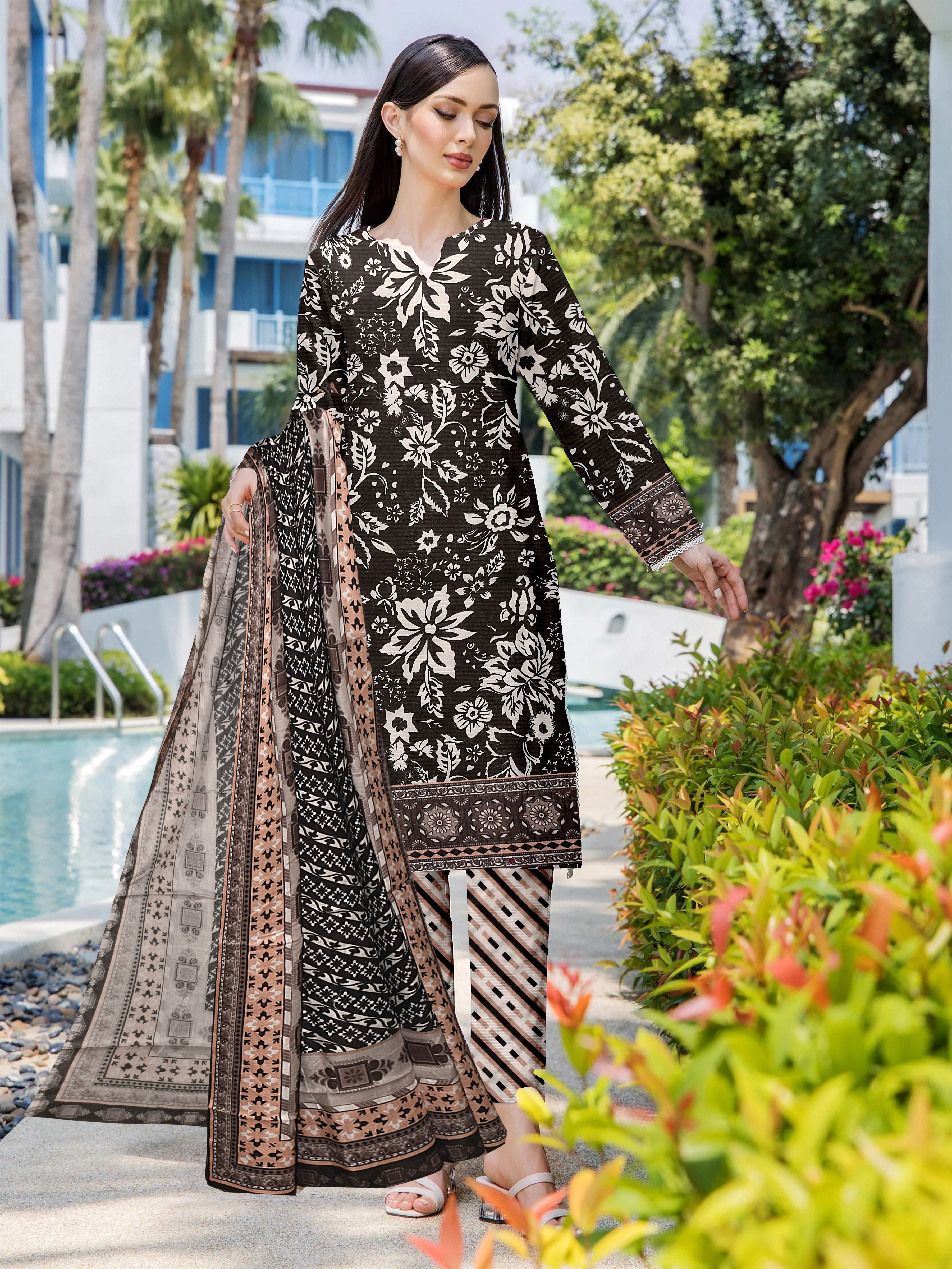 Elegant and timeless, this beautiful outfit features a black, white, and beige Bana Dara shirt and trouser, paired with a printed soft voile dupatta in black, white, and beige tones. The floral patterns and earthy hues add a touch of sophistication, making it perfect for both casual and semi-formal occasions—a graceful blend of comfort and style.