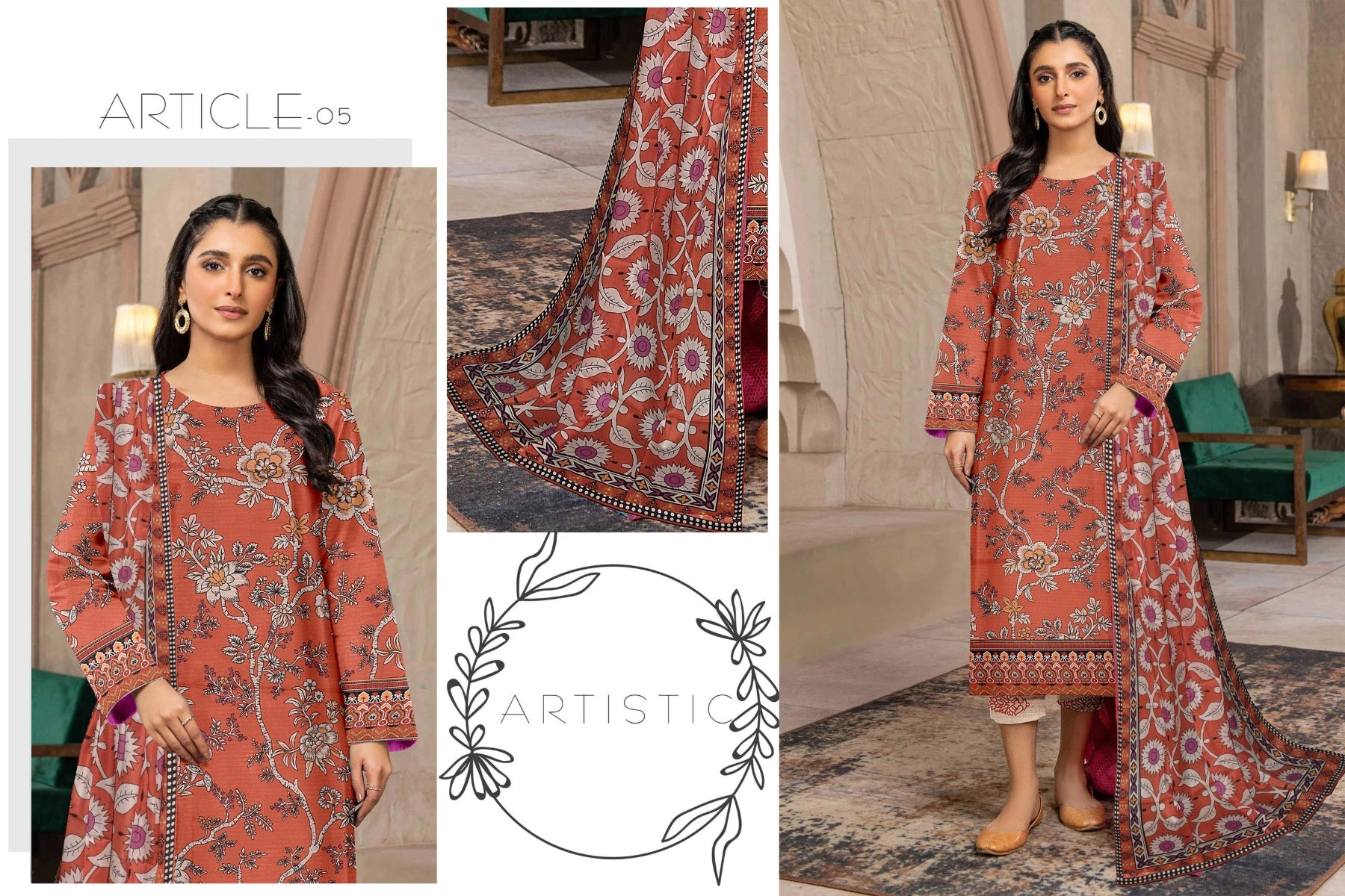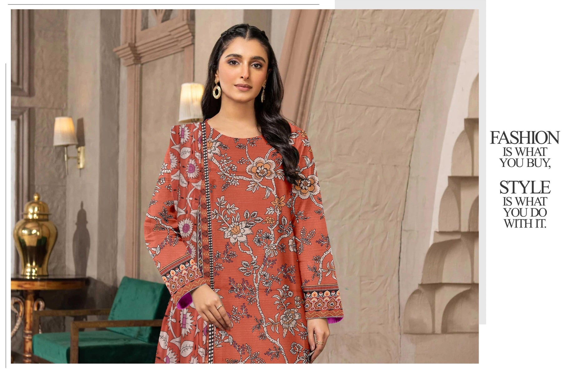 Elegant and timeless, this beautiful outfit features a rust-orange Bana Dara shirt and trouser paired with a printed soft voile dupatta in deep maroon and ivory tones. The vibrant floral patterns and rich autumnal hues add a touch of sophistication, making it perfect for both casual and semi-formal occasions. A graceful blend of comfort and style.