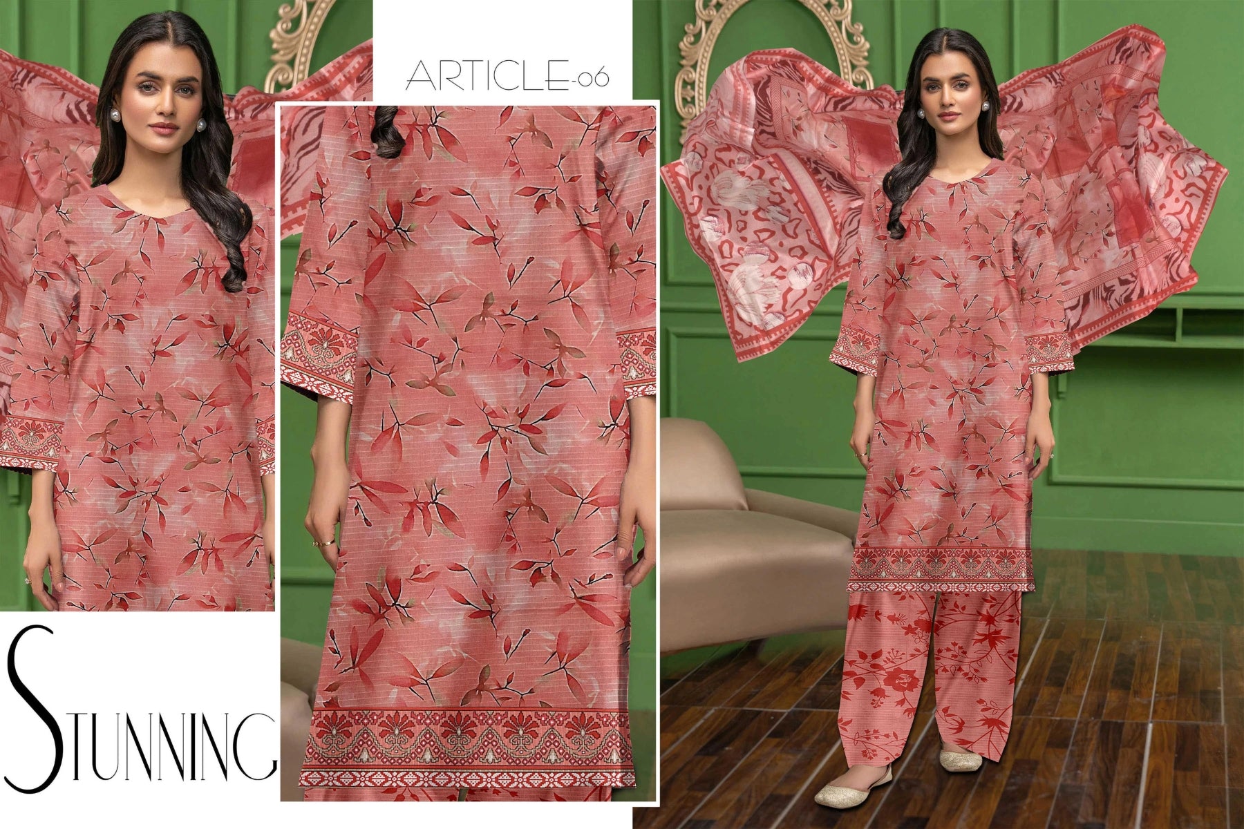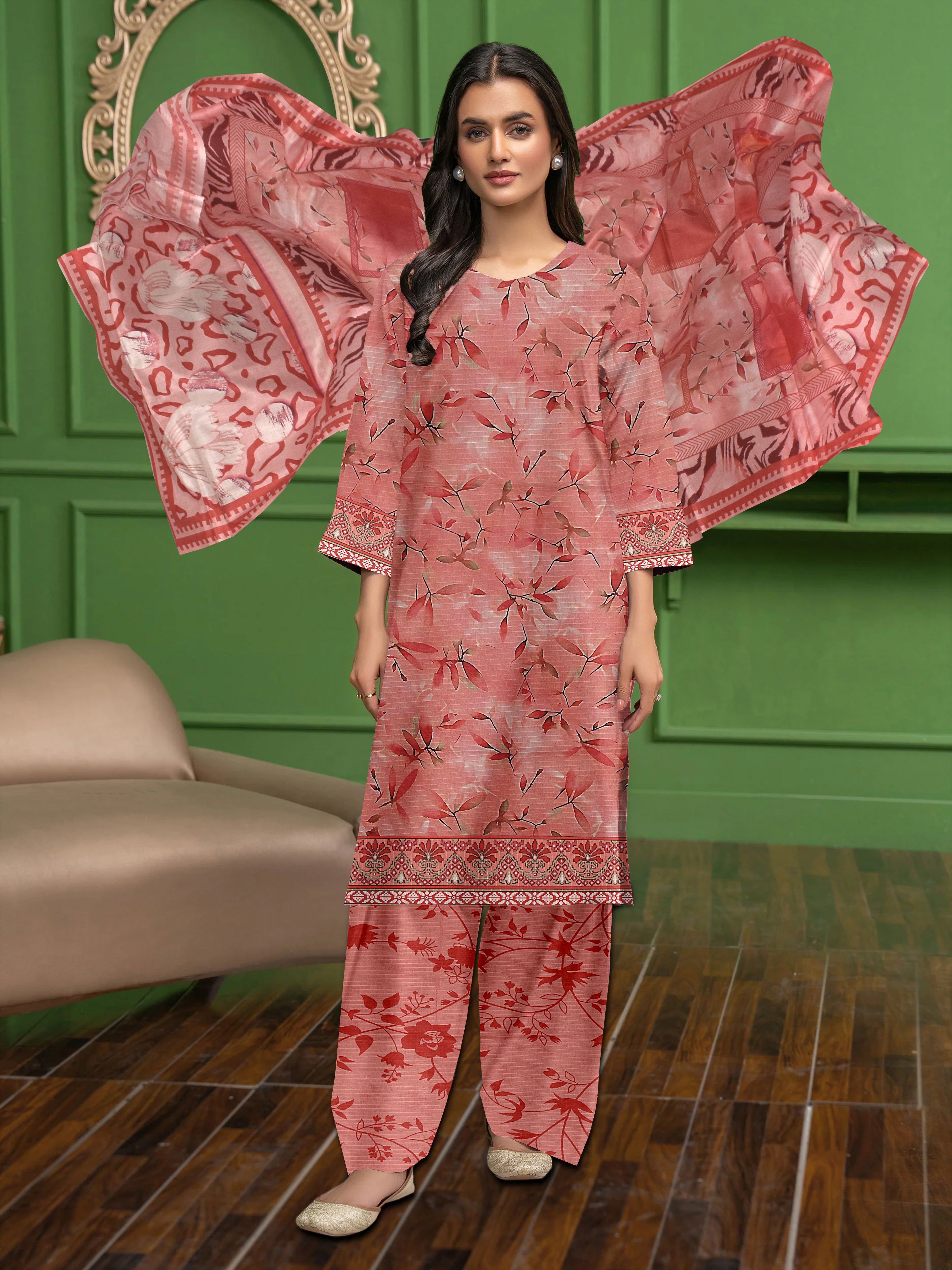 Elegant and timeless, this beautiful outfit features a predominantly pink and red Bana Dara shirt and trouser, paired with a printed soft voile dupatta in deep pink and red tones. The vibrant floral patterns and rich autumnal hues add a touch of sophistication, making it perfect for both casual and semi-formal occasions—a graceful blend of comfort and style