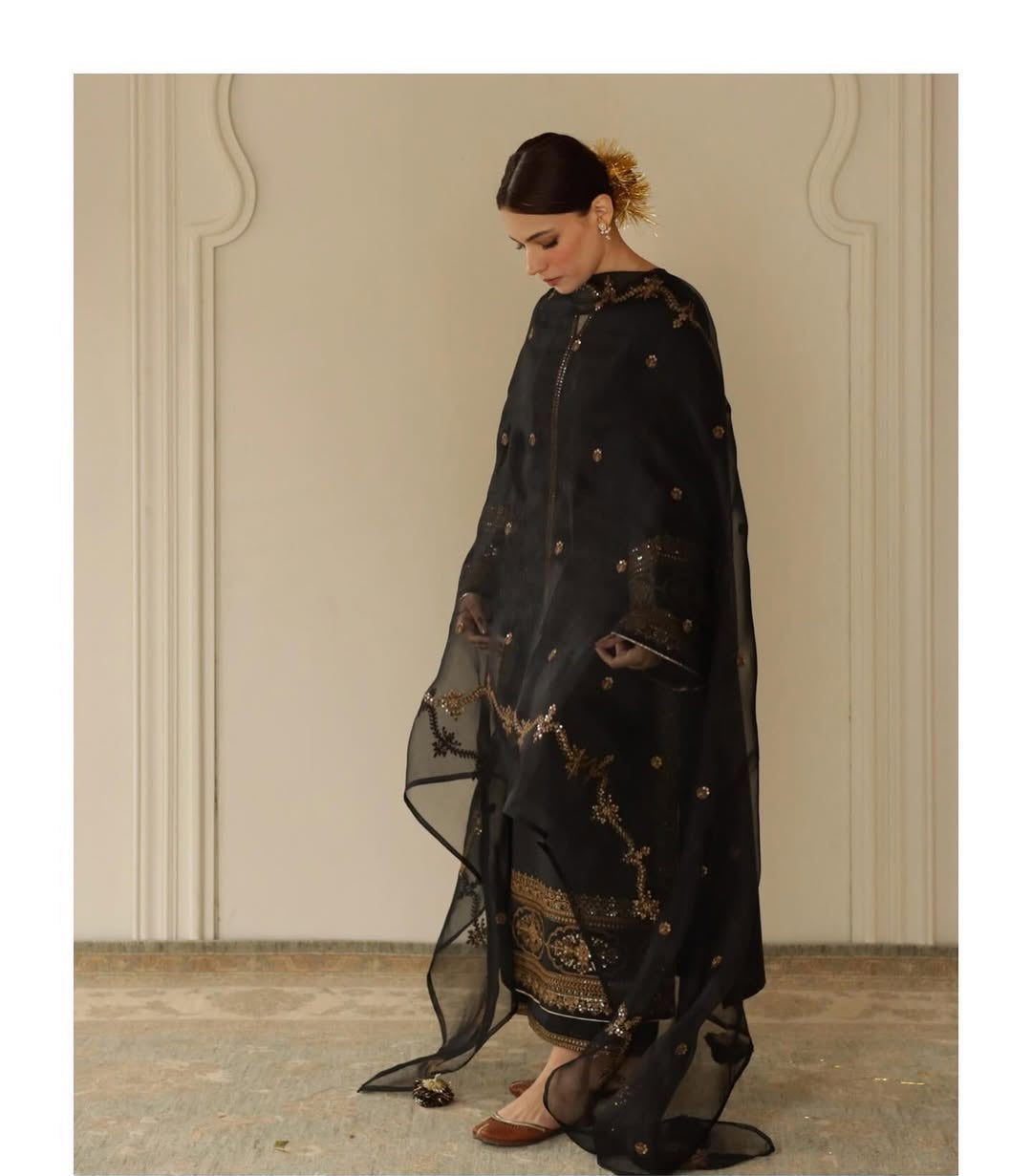 Step into effortless elegance with Dark Pearl, a refined ensemble crafted from premium lawn for a breathable yet polished look. The deep black shirt features intricate gold embroidery on the neckline and hem, paired with a complementing embroidered trouser for a graceful finish.