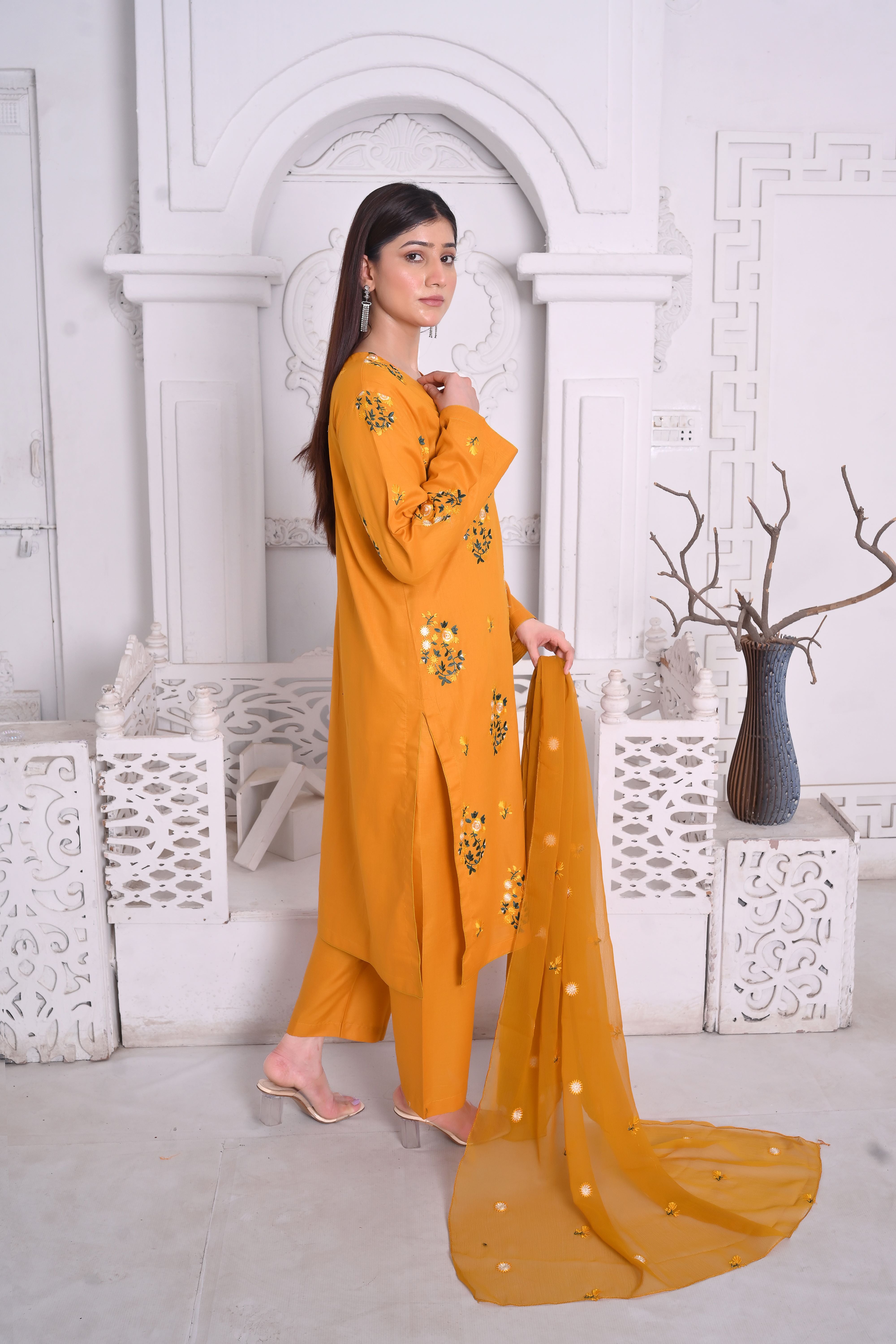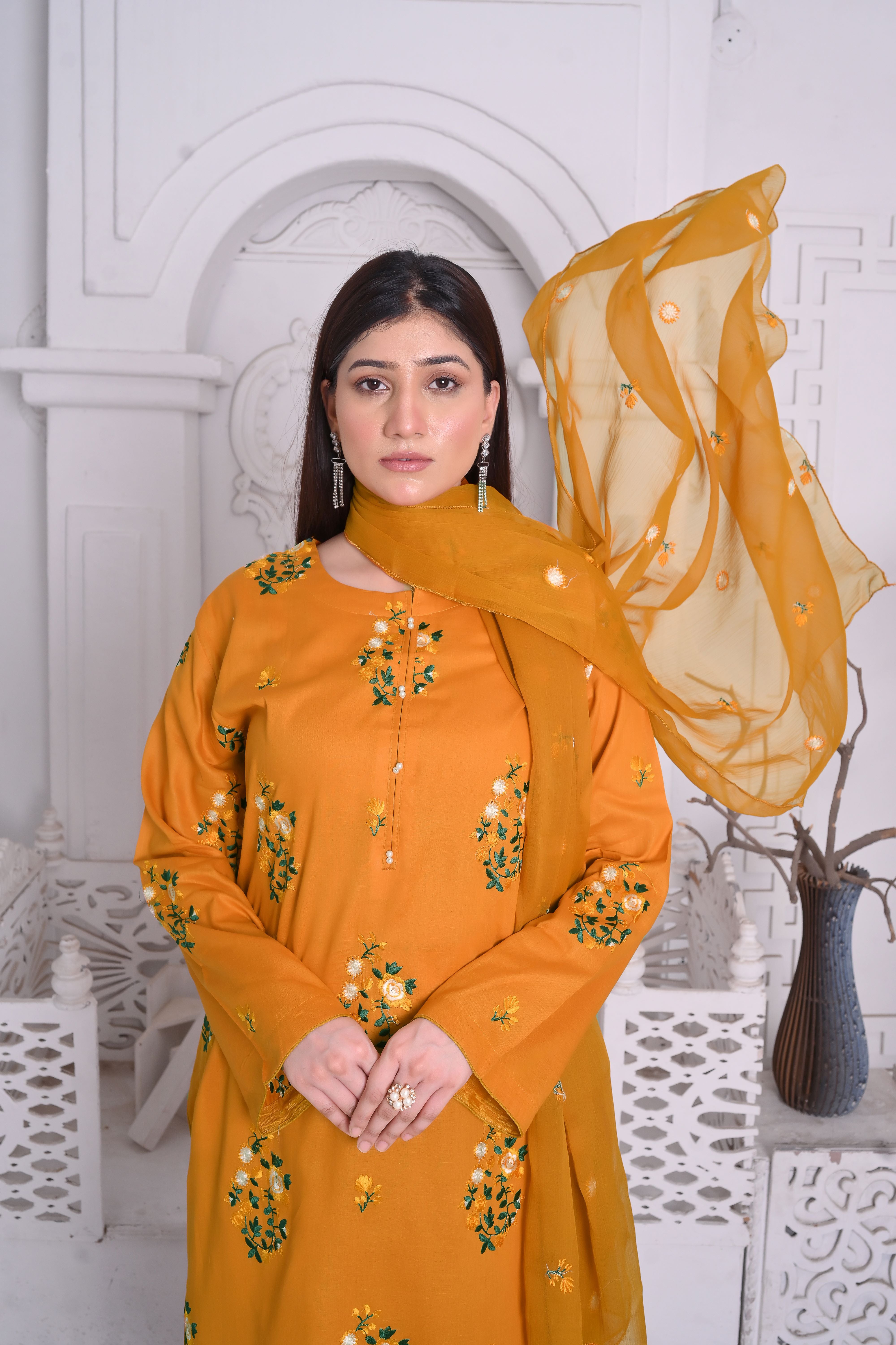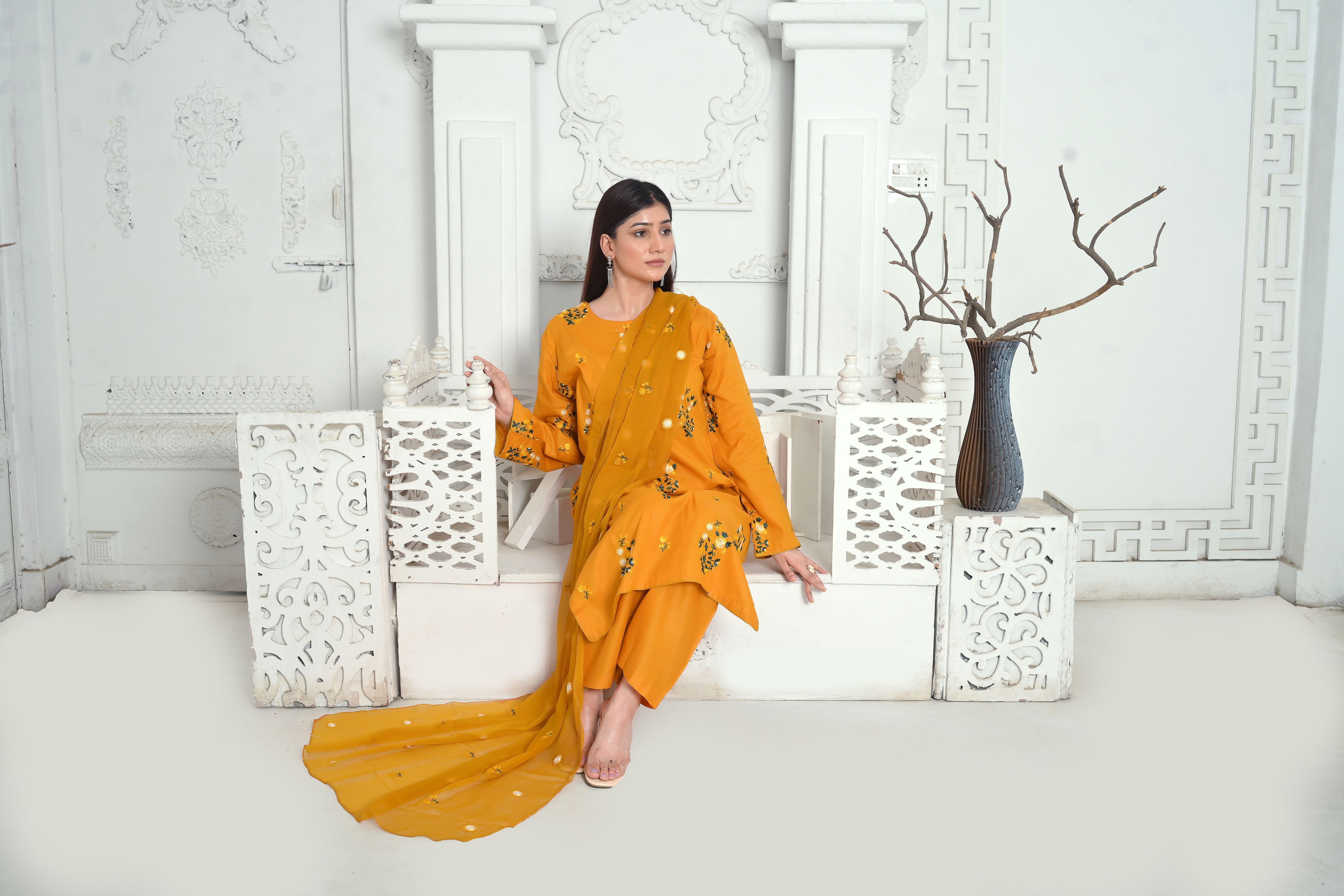 Elevate your everyday elegance with this beautifully crafted three piece outfit. Made from high quality Cambric fabric, the shirt and trouser offer a lightweight and breathable experience, perfect for winter wear. The ensemble is adorned with delicate floral embroidery that adds a touch of charm and sophistication.