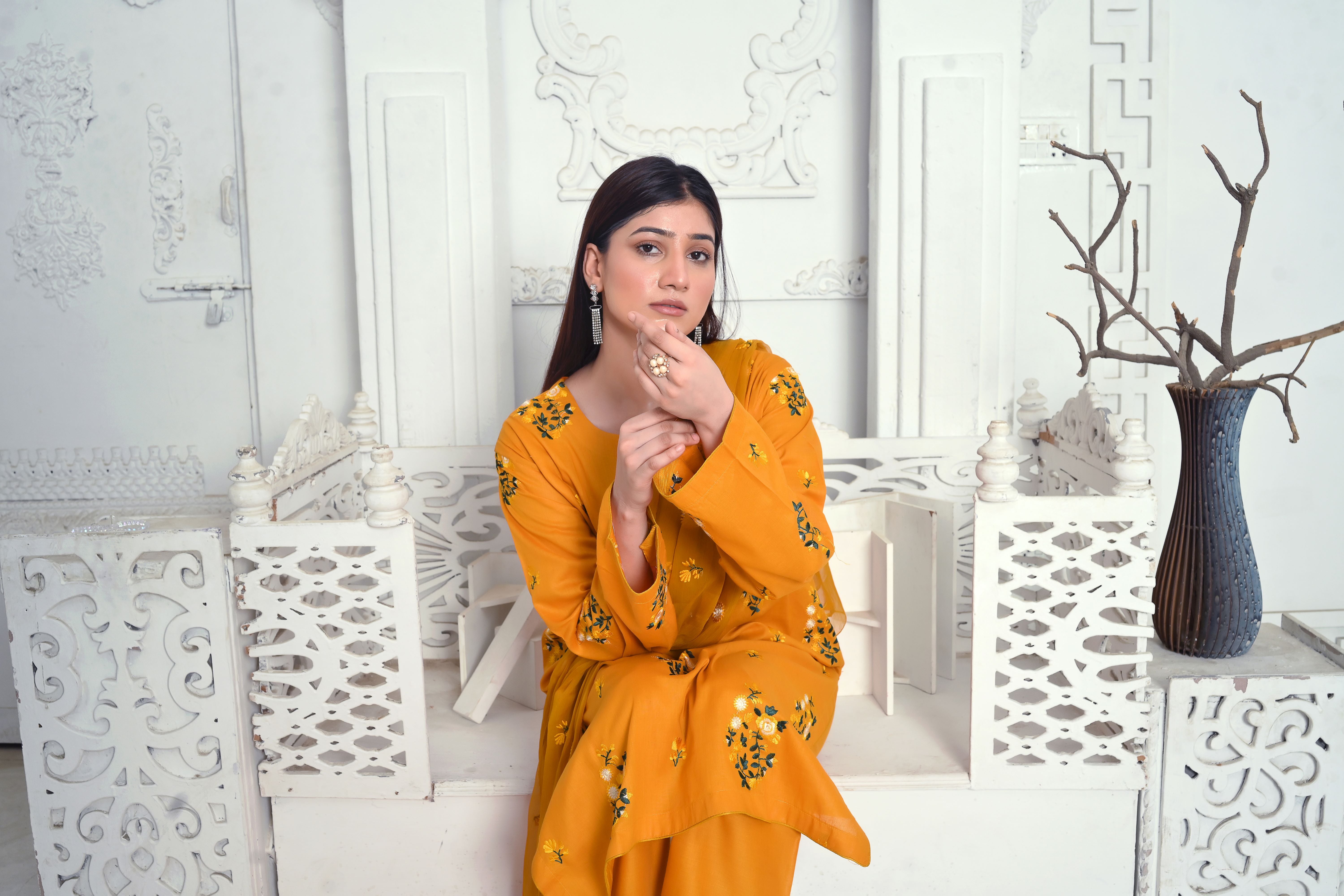 Paired with a flowy chiffon dupatta featuring scattered floral embellishments, this outfit brings together tradition and grace in one stunning look. Ideal for casual gatherings, festive lunches, or day-time events.