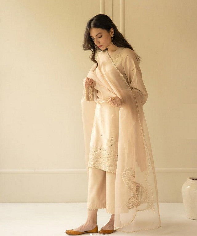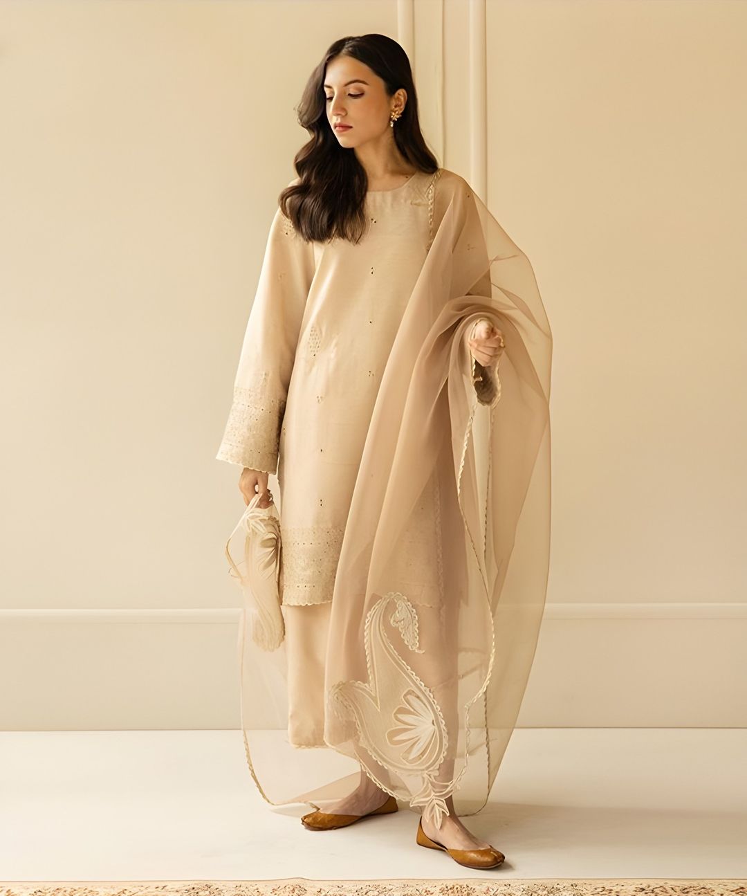 Paired with a matching lawn trouser for a clean, polished silhouette, the look is completed with a beautifully embroidered chiffon dupatta that adds a touch of sophistication and airy movement. The lightweight fabrics ensure breathability and comfort, making NOORI perfect for festive gatherings, daytime events, and summer soirées.