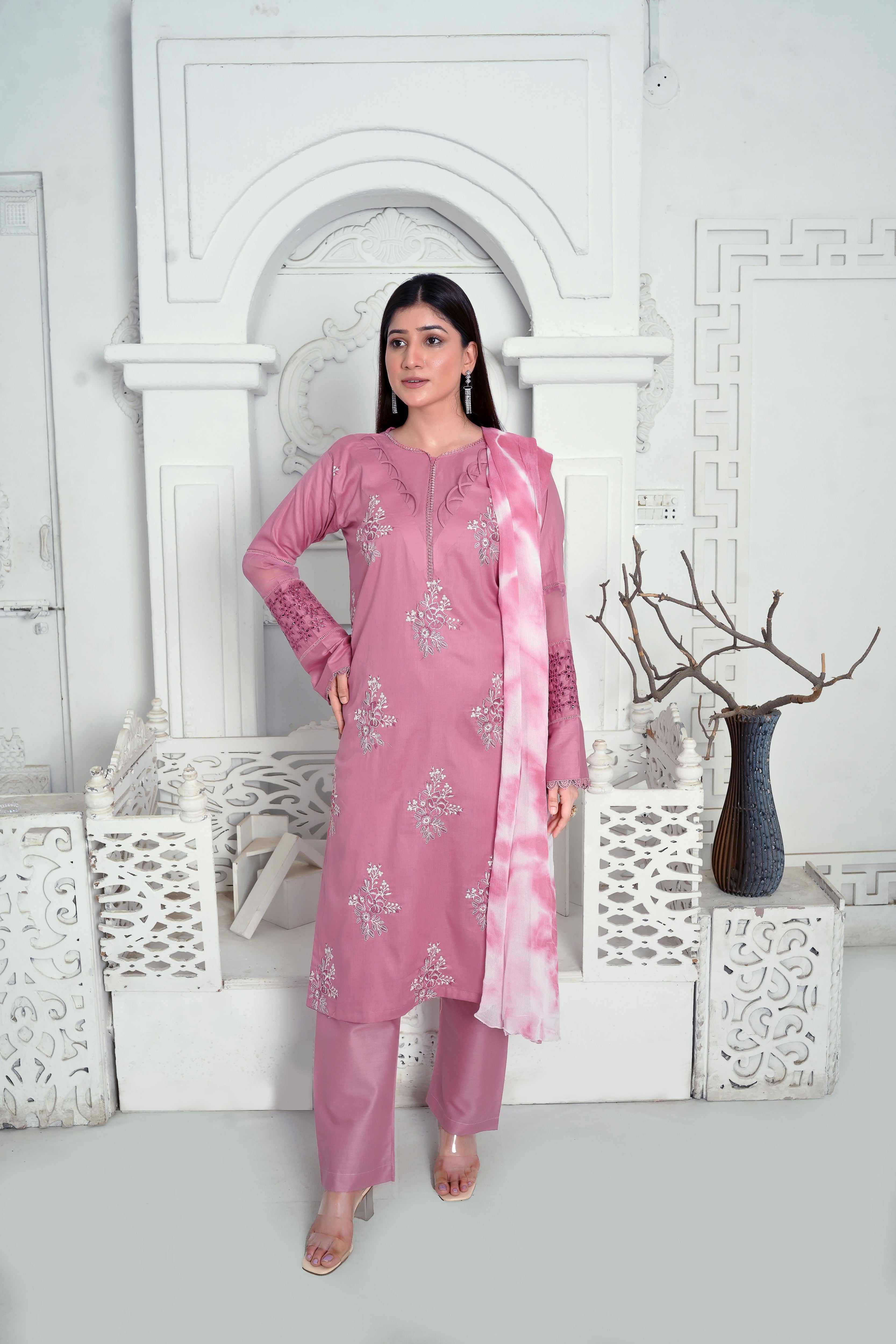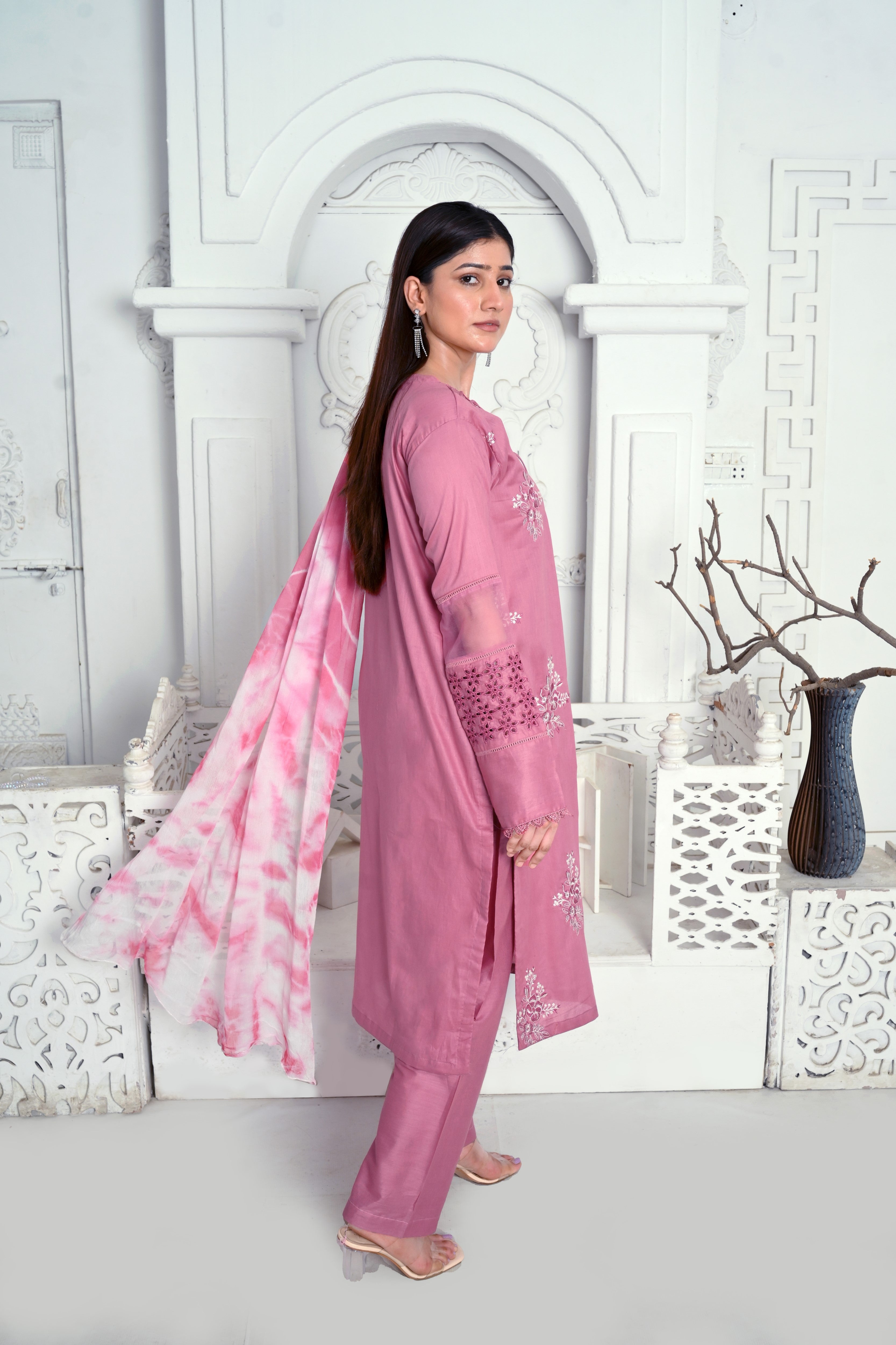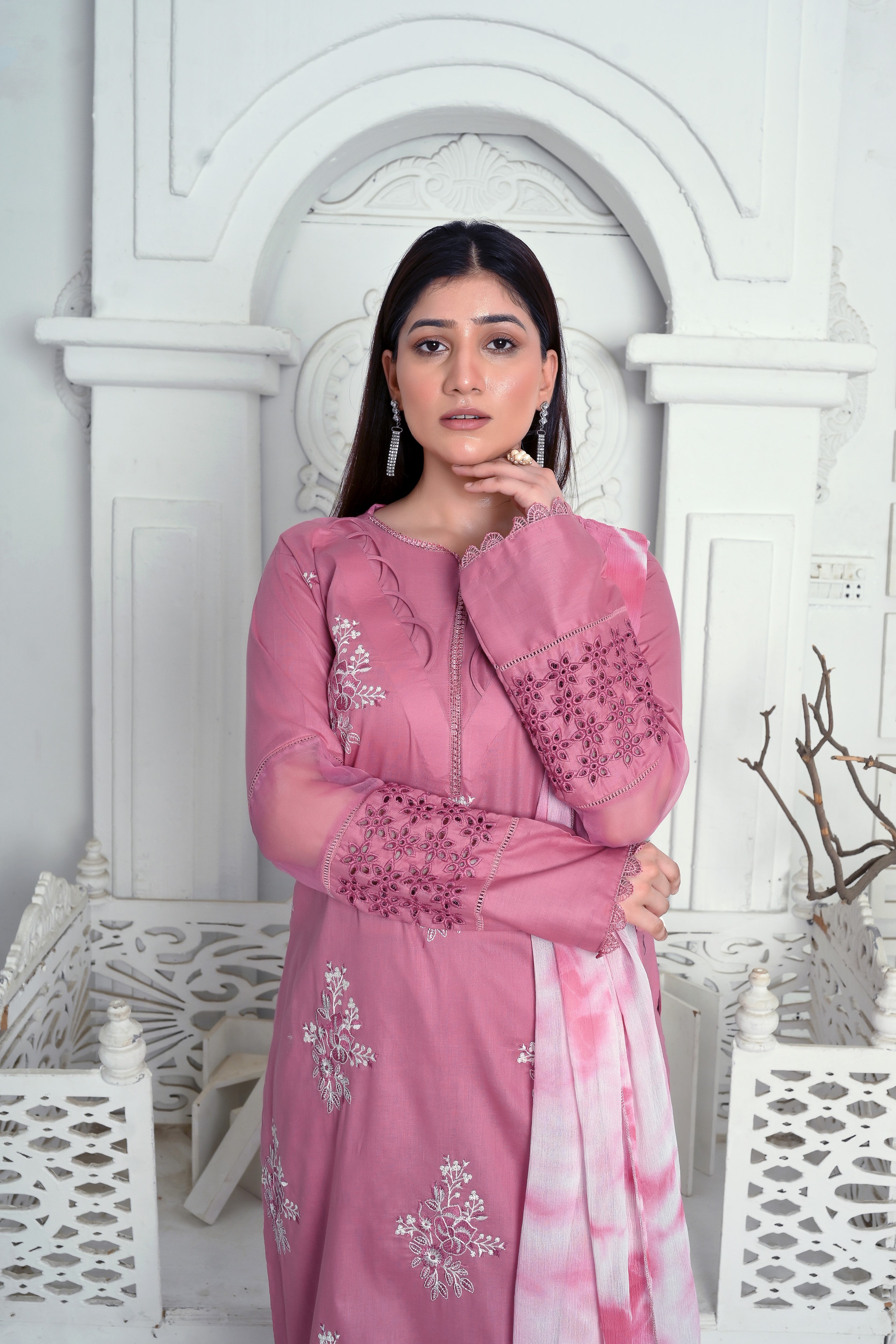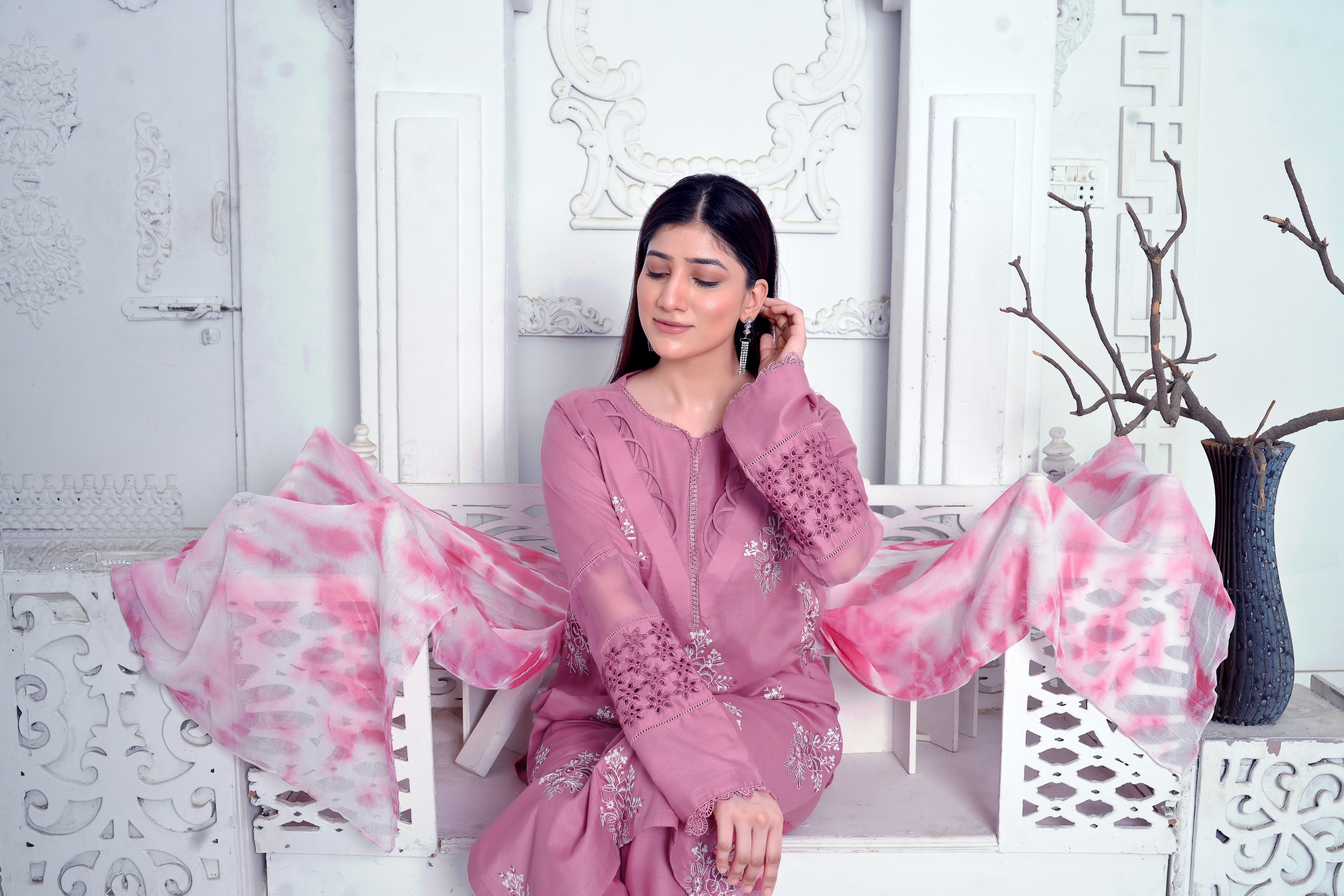This graceful 3-piece suit in a soft pink shade is the perfect blend of sophistication and charm. The shirt features delicate embroidery across the front, creating a refined and timeless look. The sleeves stand out with intricate boring-style embroidery and sheer tissue detailing that adds a soft, feminine flair.