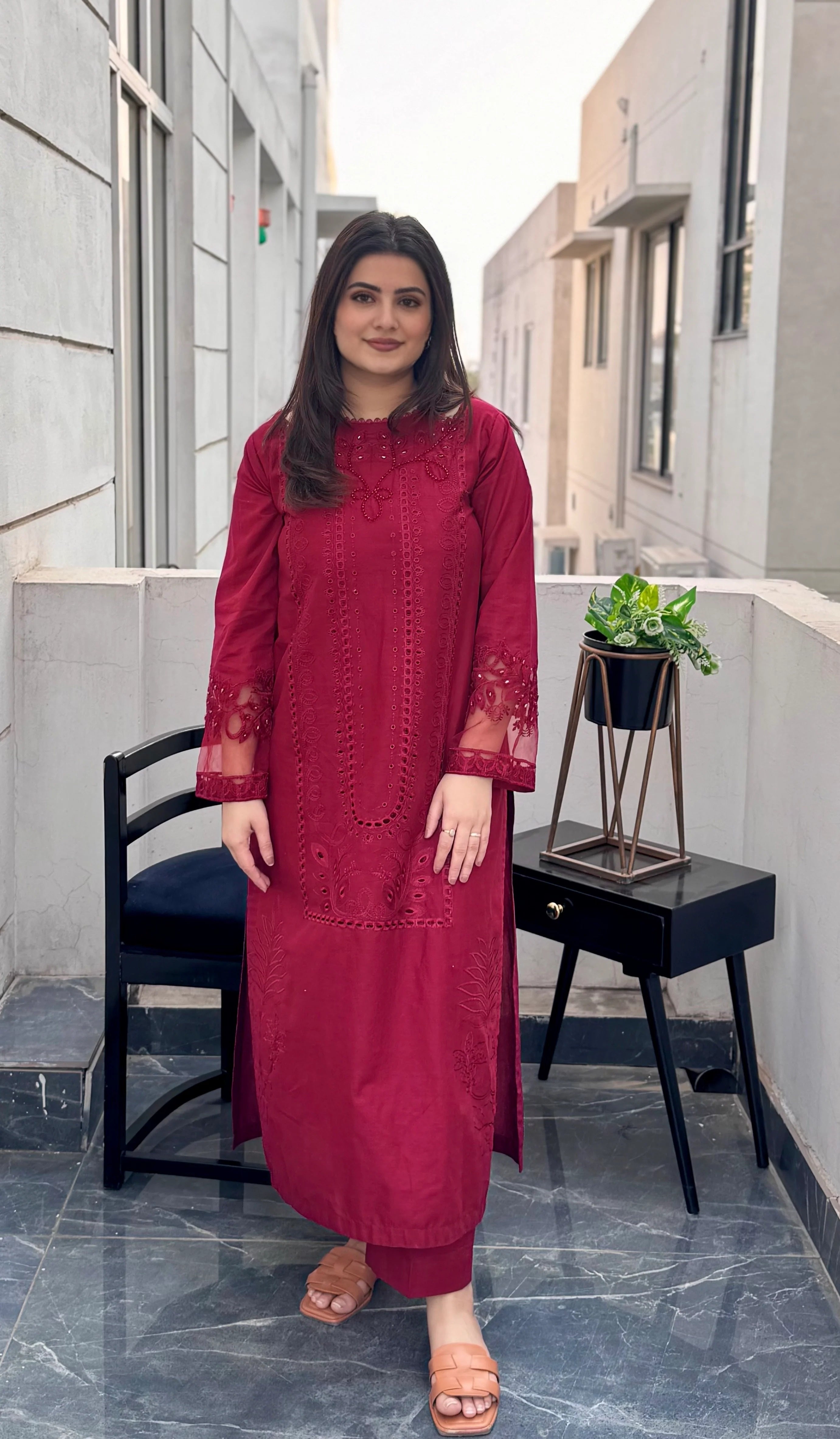 This ensemble is a seamless fusion of refined tradition and modern grace, tailored in soft Marina fabric for cozy winter wear. Delicate embroidery stretches across the entire design, enhancing the fabric’s warmth and richness. The sleeves feature tissue detailing, elevated with intricate threadwork that adds depth and softness to the look. Perfect for festive occasions or elegant everyday wear, this outfit speaks sophistication in every detail while keeping you comfortable in colder months.