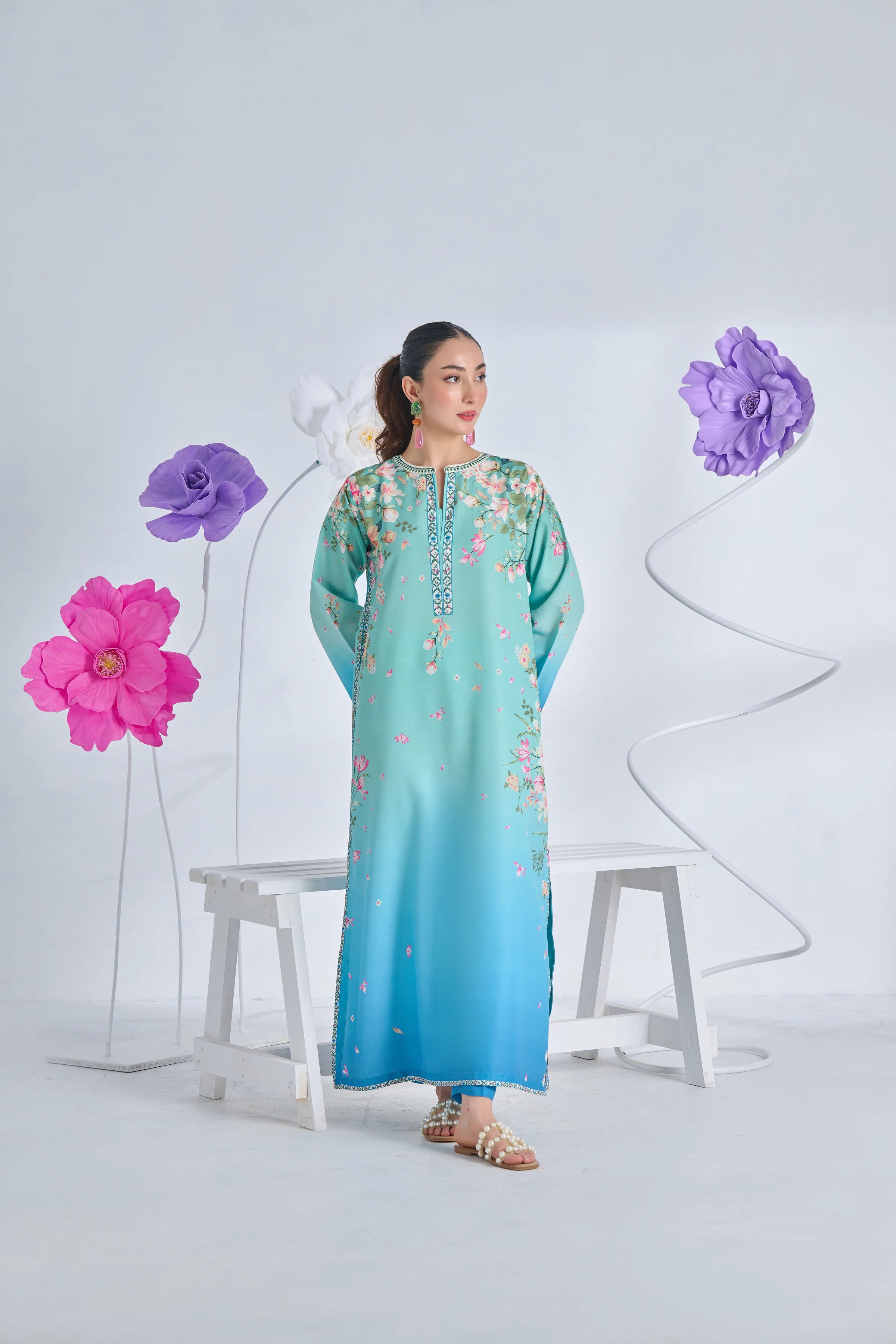 Step into elegance this winter with Veronica, a beautifully crafted co-ord set designed in luxurious silk fabric. The soothing aqua-to-blue gradient blends seamlessly with delicate floral artwork, giving the outfit a dreamy and feminine charm. Perfect for winter soirées, brunch dates, and intimate gatherings, this look promises effortless style and comfort.